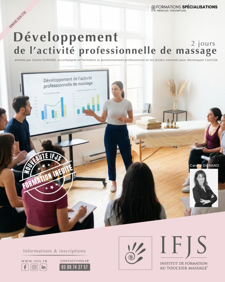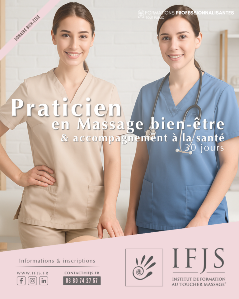 A l’IFJS, institut de formation au Toucher-Massage, nous formons les professionnels de santé pour l’amélioration de la qualité des soins dans toutes les spécialités médicales. Nos formations s’appuient sur des recherches cliniques validées scientifiquement, ainsi que sur des travaux de recherche en pédagogie uniques en France pour vous transmettre des compétences innovantes, rigoureuses et efficaces, adaptées à votre environnement professionnel.