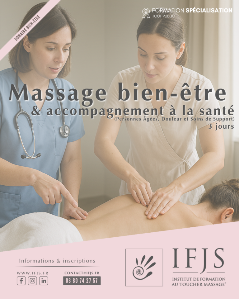 Nous formons à un massage structuré, responsable et utile : un massage qui respecte la personne, le cadre, et la réalité du terrain — dans l’univers du bien-être comme dans l’accompagnement en santé, toujours dans une démarche rigoureusement complémentaire à la prise en charge médicale.